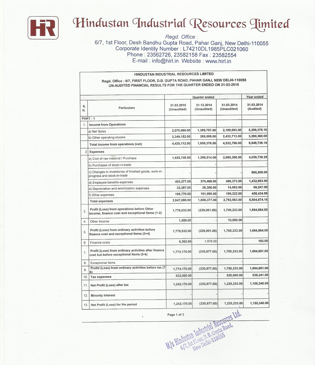 QUARTERLY RESULTS MARCH 2015